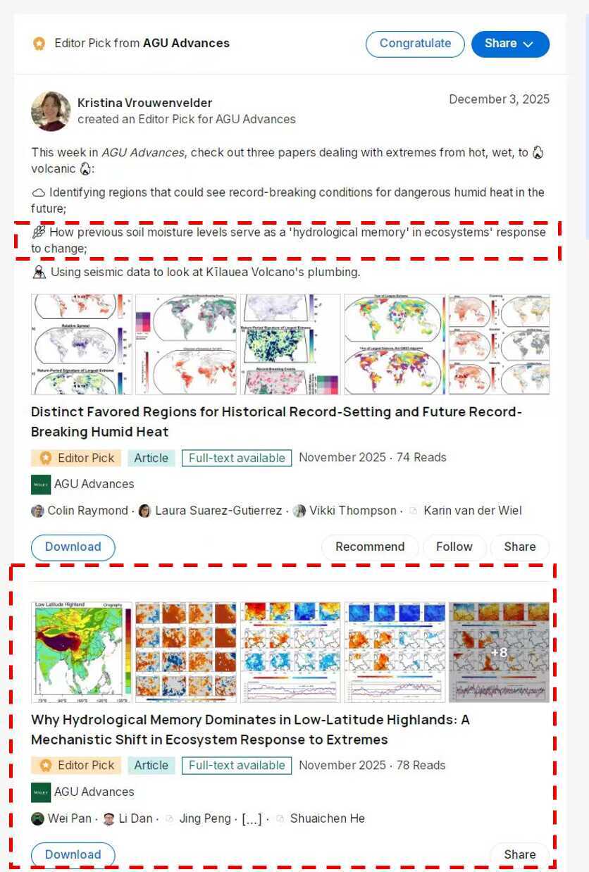 图1. 论文入选《AGU Advances》Editor's Pick(编辑精选),并获得期刊首页重点推介。