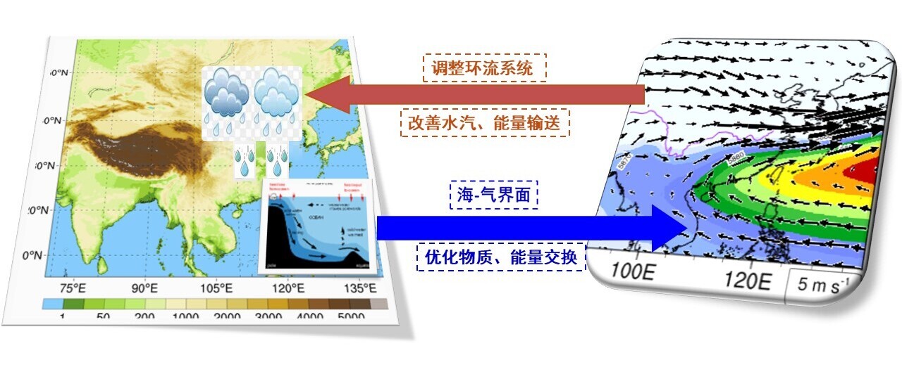 图2. 区域地球系统模式海-气耦合版改进2020年江淮流域极端梅雨事件模拟的物理机制示意图。