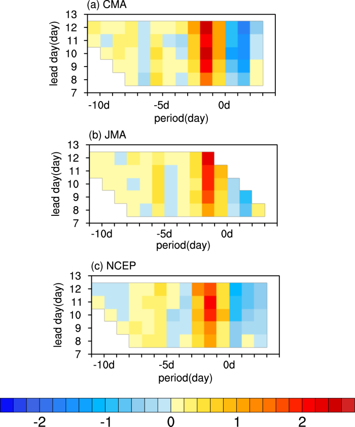图2 误差增长率的演变(单位:°C/天),0d表示事件的峰值日,纵坐标表示起报时刻超前事件峰值日的天数。预报数据来自(a)中国气象局(CMA)、(b)日本气象厅(JMA)和(c)美国国家环境预报中心(NCEP)。